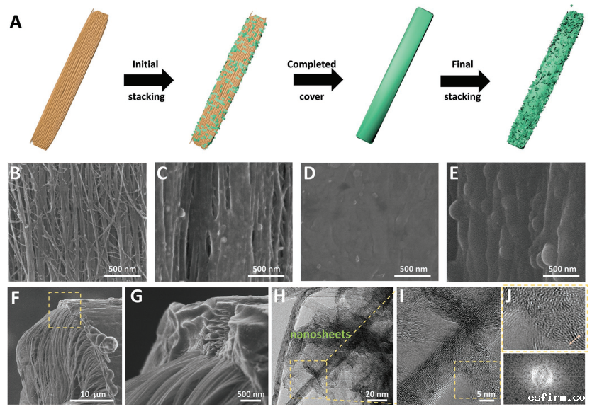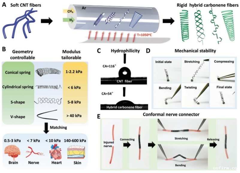 研究采用模板诱导法,先将软碳纳米管纤维粘在模板上。然后,通过无催化剂的热化学气相沉积工艺在CNT衬底上生长刚性石墨烯纳米片(highly disordered graphene nanosheets,HDGNs),最终将其从模板中拿出后仍保持预定的复杂形状。对于不同的应用场合,通过改变模板的形状可以方便地定制杂化碳纤维的形状。