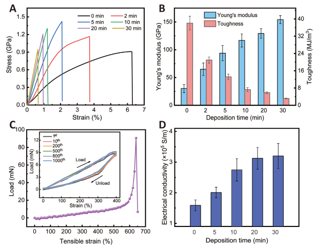 为了解碳纤维的本征力学性能,研究首先对直接混杂的碳烯纤维进行了拉伸试验。结果表明,随着沉积时间的增加,碳烯纤维的杨氏模量有明显增加,而韧性却明显降低。碳纳米管粗纤维的拉伸强度为1.0 GPa左右,杨氏模量为30.1 GPa左右,韧性为38.0 MJ/m3左右。另一方面,碳烯弹簧在0~700%应变范围内的整个应力-应变曲线如下图C所示,从而证明文章所提出的碳烯弹簧具有很好的柔韧性。HDGNs的引入还会影响材料的电学性能。虽然碳纳米管纤维具有高达1.5×105 S/m的良好导电性,比大多数碳材料的导电性更好,但通过在其表面涂覆HDGNs可以进一步提高其导电性。