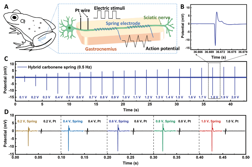 研究将混合碳烯弹簧的电极植入牛蛙坐骨神经表面以记录动作电位(AP)。在坐骨神经的一端采用一根铂丝作为刺激电极,而在另一端采用两个混合碳烯弹簧电极作为记录电极。由于弹簧电极具有良好的形状恢复性能和在大变形下的电导率稳定性,弹簧电极可以在动态运动过程中紧密地附着在神经上并传递信号。在一系列单相矩形波刺激下,诱发的AP沿神经传递,并经由弹簧电极记录。由于杂化羰基光纤具有突出的电性能和机械性能,得到的信号显示出较高的信噪比。采用恒定频率为0.5 Hz、宽度为2ms的不同刺激电压,产生一系列AP。诱发的AP峰值随外加刺激电压的增加而增加,在电压达到1.6V后保持稳定,这可能与神经细胞的饱和跨膜电位有关。值得注意的是,碳电极记录的AP明显高于Pt电极。结果显示,碳烯电极表现出比传统金属电极更好的性能,其峰-峰AP比Pt电极高310%。