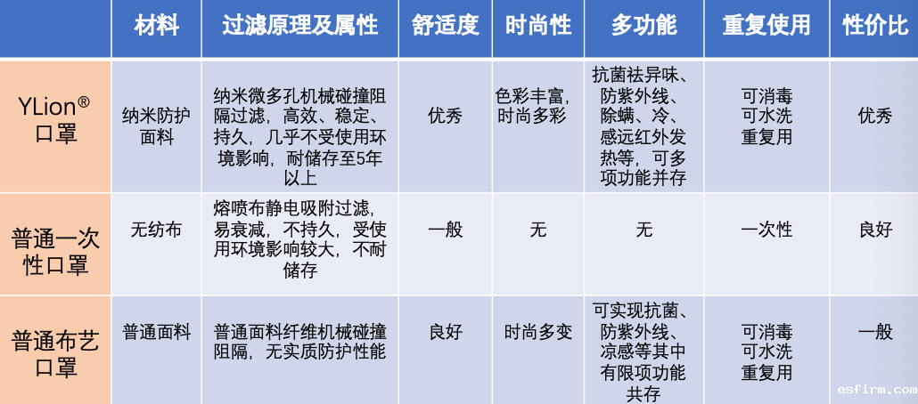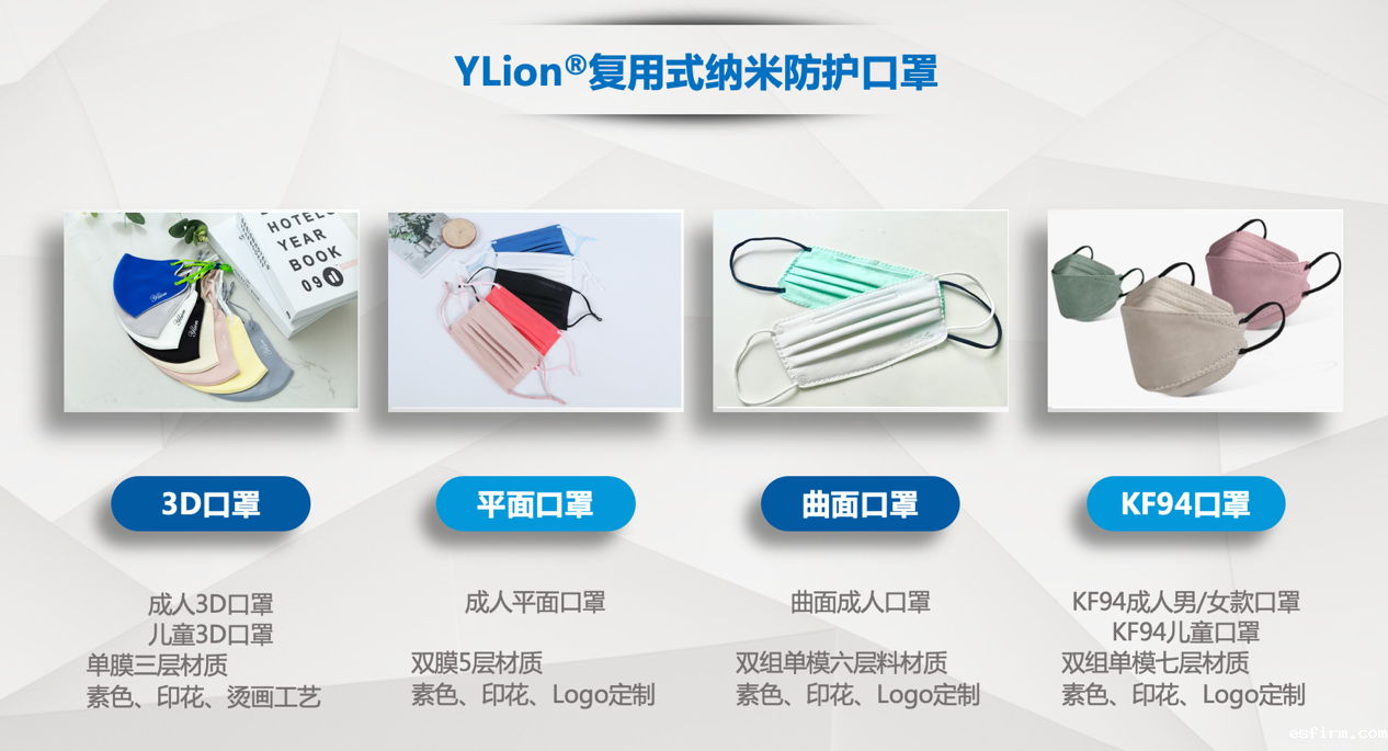 通过颗粒物大小对比图和PTFE纳米微多孔过滤膜微观图,我们不难发现,PTFE纳米微多孔过滤膜可以高效阻隔过滤空气中的污染源颗粒物。鉴于PTFE膜的高度稳定性,其高效过滤性能是稳定且持久的,把针织面料复合在PTFE膜的两侧,不仅能对其起到保护作用,又能保证整体复合材料的透气性。内外侧针织面料的材质和结构可以是多变的,得益于丰富多彩的面料印染及后整理工艺,为YLion® 复用式纳米防护口罩开启了舒适、时尚及多功能端口。可以通过赋予内外侧针织面料不同的色彩和功能(如防水、抗菌、防晒、凉感等),实现整体口罩集高效防护、高度舒适、高分颜值于一身。