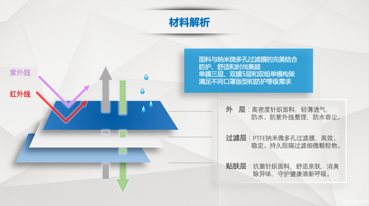 复用式纳米防护口罩的主材料为纳米防护面料,它采用PTFE纳米微多孔过滤膜作为核心过滤元件,将其与舒适亲肤的功能性针织面料通过先进工艺复合,形成稳固的“三夹板”或“五夹板”结构,实现防护、舒适、时尚的有机整合。