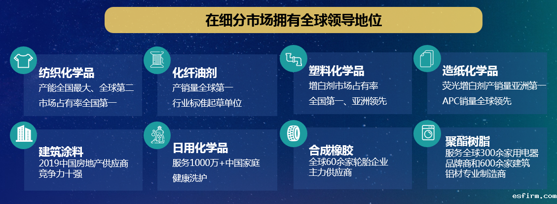 传化化学是一家技术驱动的企业,从基于客户的需求与实际痛点出发,研发出领先的化学解决方案,并将此过程中沉淀出核心共性技术模块拓展到其他丰富的行业应用场景。传化化学在细分市场拥有全球领导地位,纺织化学品的产能全国最大、全球第二市场占有率全国第一;化纤油剂的产销量全球第一,是该领域的行业标准起草单位。