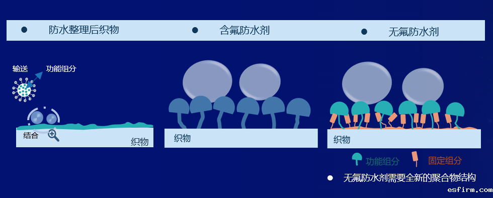 含氟防水剂依赖于氟酯单体的强结晶性能,其很容易在织物表面完成规整的定向排列。但是结晶性能较弱的无氟防水剂,想要达到一样的防水效果就会困难得多,因此一般的无氟防水剂都会设计特有的“固定组分”,帮助防水组分完成在织物上的定向排列,各无氟防水剂的性能差异,很大程度上就是固定组分的差异。此外,传化通过采用比较完善的表征方法,比如用接触角更精准地表征最终的防水效果,通过扫描电子显微镜和能谱联用以及临界液体体积法,更为精准地对防水剂在织物表面的分布进行表征。