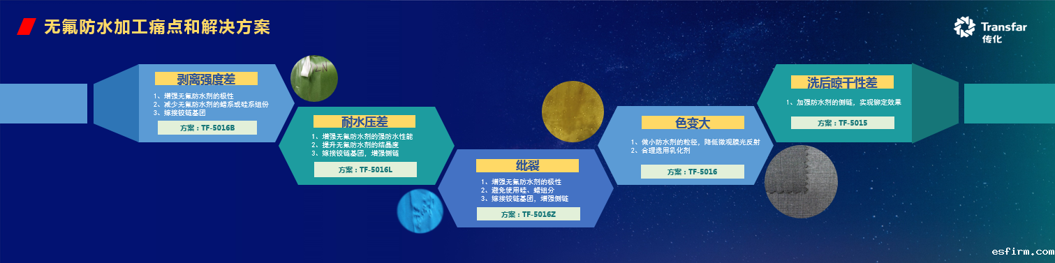 在无氟防水加工过程中,还会存在剥离强度差、耐水压差、纰裂、色变大、洗后晾干性差等痛点,传化也推出了相应的解决方案。