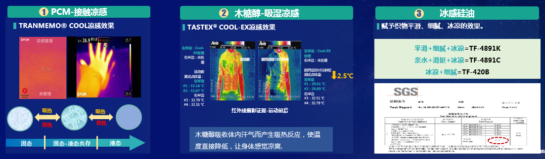 近几年,凉感整理成为市场消费的热点,被称为“穿在身上的空调”。传化可提供三种凉感整理解决方案:PCM相变材料、木糖醇和冰感硅油。