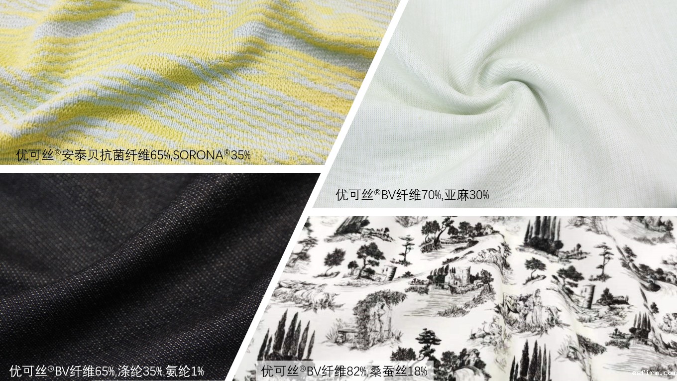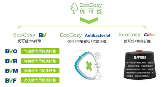 优可丝®是赛得利公司旗下的绿色纤维素纤维品牌,源自天然可再生林木,可循环再生,自然降解。其中,优可丝® BV系列产品通过产业链整合,从纱线的生产效率、纱线和面料品质、纺纱设备维护等多方面进行改进,将纤维开发与下游应用紧密结合,纤维以其优异的性能为下游纺纱应用带来更多开发潜能;优可丝® 安泰贝® 抗菌纤维通过纺前注射技术在纤维中加入活性抗菌物质,使得抗菌物质均匀分布在纤维表面及内部,能够有效抑制细菌滋生,且更加持久;优可丝®菁彩纤维则采用区别于传统染色工艺的原液染色工艺进行生产,使纤维拥有更好的染色均匀度和色牢度,衣物洗后不易褪色,大幅降低了水的消耗和化学品的使用。