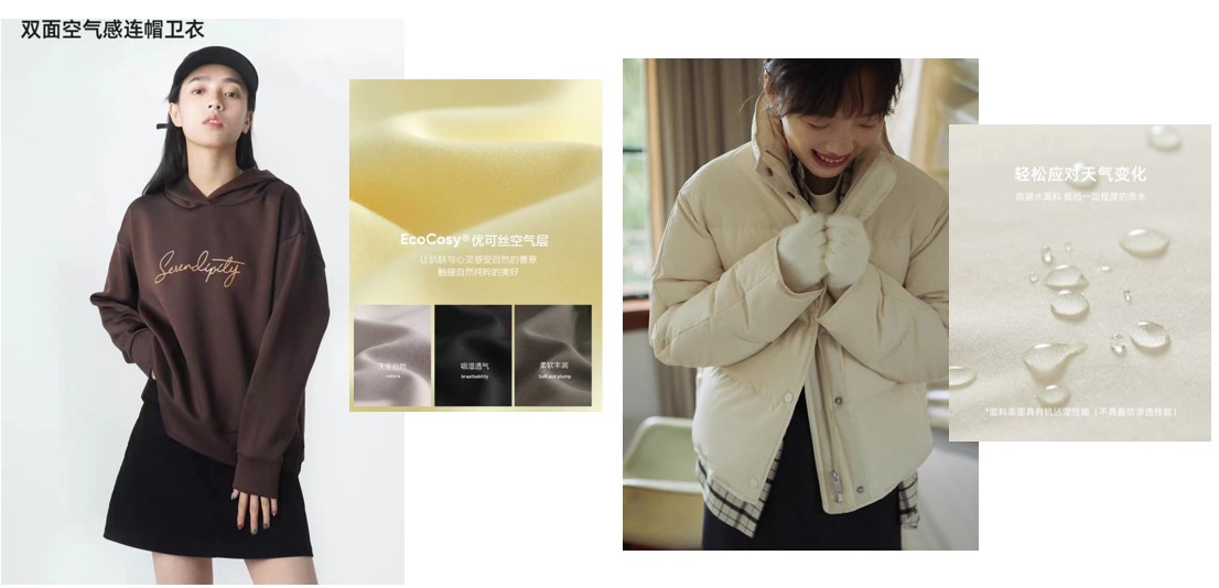 在针织领域中,常见的空气层面料多采用涤纶、锦纶等合成纤维编织完成,粘胶纤维虽然吸湿亲肤性更好,且可以增加面料的悬垂性,但出于弯折后易产生折痕的担心而不敢轻易尝试。在接触到赛得利联盟并深入了解了优可丝®的优势性能和赛得利研发团队的推广模式之后,企业与赛得利联合开展了一系列开发试验,最终开发开发出优可丝®空气层面料,在保证保形性的前提之下,增强了面料的穿着舒适性和时尚感。在机织领域中,防寒服面料基本都是合成纤维长丝来织造,既开发出“优弹®”针织面料之后,赛得利与联盟企业、终端品牌进一步开展合作,通过优可丝®短纤与SORONA®长丝交织的形式,并复合防水、防风等多重功能,打造出不止于暖的羽绒服面料。