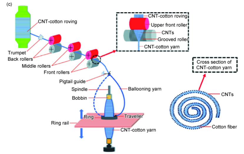 此外,国外某研究团队研发了由一种智能纱线织成的毛衣和围巾,可为手表等提供电能。该纱线是一种防水的柔性可充电纱线,而且可剪裁。具体制备方法为:将碳纳米管纤维捻成纱线,然后将液体锌涂在纱线上形成阳极,另一组涂上氧化镁形成阴极,然后将两片扭曲成双螺旋结构,并涂上聚丙烯酰胺电解质,再包裹于硅树脂中。该纱线性能稳定,充电容量高。我国某研究团队利用一种简便而原始的方法制备棉粗纱和碳纳米管(CNT)相结合的柔性导电纱线,通过将CNT组装到棉纱上,然后在环锭纺纱中通过加捻使其被纤维包覆,所得纱线具有良好的导电性和耐久性。