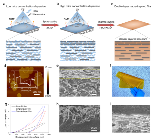 科研人员将前期开发的具有优异力学性能、紫外屏蔽功能且可宏量制备的云母纳米片(Nat. Commun. ,2018, 9, 2974)作为构筑基元,与聚酰亚胺前驱体共组装得到聚酰亚胺-云母纳米复合膜,利用云母的优越本征特性来弥补聚酰亚胺的不足。区别以往仿珍珠层纳米复合膜的单层结构设计,本研究中,研究团队改变组分配比,借助喷涂与热固化联用法,构筑了具有双层类珍珠层结构的聚酰亚胺-云母纳米复合膜,使其顶层具有更致密的云母纳米片(图a-f)。这种设计策略实现了材料力学性能的有效提升,并使其上表面对原子氧、紫外辐射和空间碎片等具有更高的抵抗性能。