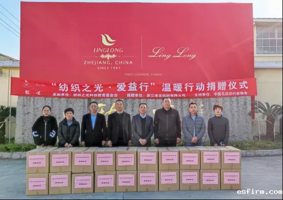 浙江凌龙智尚科技股份有限公司在本次温暖行动中捐赠价值189470元的长款羊毛大衣、羊毛保暖外套、保暖针织衫共计362件。凌龙拥有意大利、德国、日本等精良设备,形成集梳纺、织造、染整、服装为一体的、科学的研发、生产体系。同时,公司擅长使用山羊绒、兔毛、羊驼毛、马海毛、蚕丝、驼绒、牦牛绒等特种动物纤维和美丽诺羊毛,创造一系列具有经典、时尚和功能性的高端、奢华的毛织品。