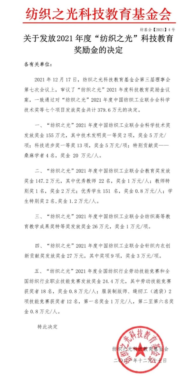 2021年12月17日,纺织之光科技教育基金会第三届理事会第七次会议在北京举行。会议审议了“纺织之光”2021 年度科技教育奖励金议案,一致通过对“纺织之光”2021 年度伟德app官方正版下载地址科学技术奖、“纺织之光”2021 年度伟德app官方正版下载地址教育奖、“纺织之光”2021 年度伟德app官方正版下载地址纺织高等教育教学成果奖、“纺织之光”2021 年度伟德app官方正版下载地址针织内衣创新贡献奖等七个项目发放奖金共计379.6万元的决定。