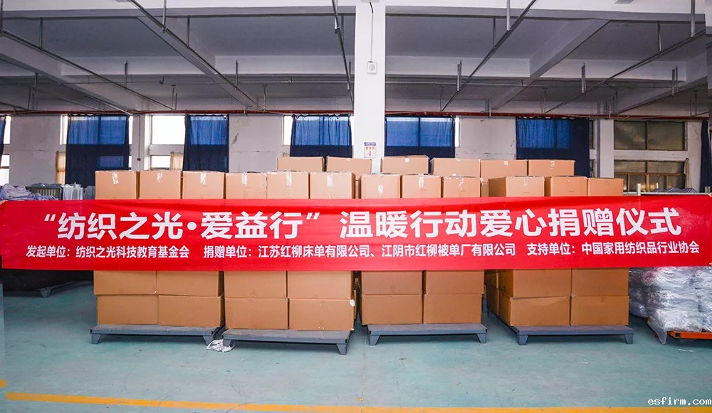 江苏红柳床单有限公司(江阴市红柳被单厂有限公司)是中国家纺行业竞争力十强企业,中国纺织国际布局示范企业。本次捐赠家纺四件套1000套。科技是企业的发展之源。多年来,红柳十分重视对功能性、环保型家纺产品和面料的研究,企业连续11年获得国际环保纺织协会颁发的“绿色环保信心纺织品标准证书”(Oeko-Tex standard100)。作为一家大型专业化的床品生产企业,红柳产销量连续多年位居中国床品行业前列。红柳所提倡的价值观是:低成本、好产品,为世界人民创造价值。