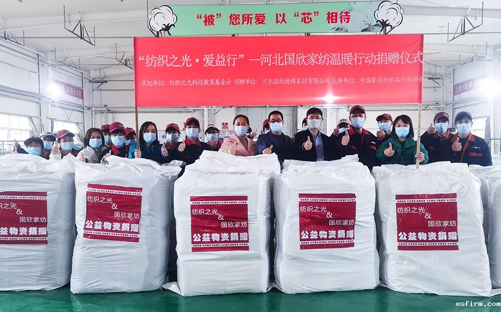 据了解,2008年汶川地震的时候河北国欣纯棉家纺开始捐送棉被5500条,公司上到董事长下到基层员工全体连夜加班加点,两天时间做出5500条棉被,专车送往汶川。2019年开始,每年入冬前为四川大凉山孤寡老人和孩子组织捐赠一批厚被子。