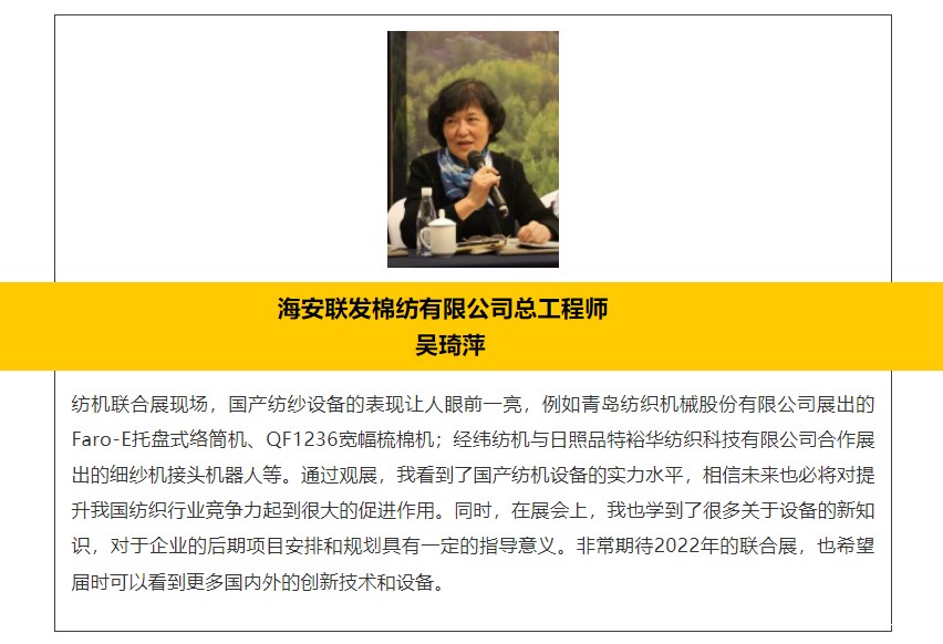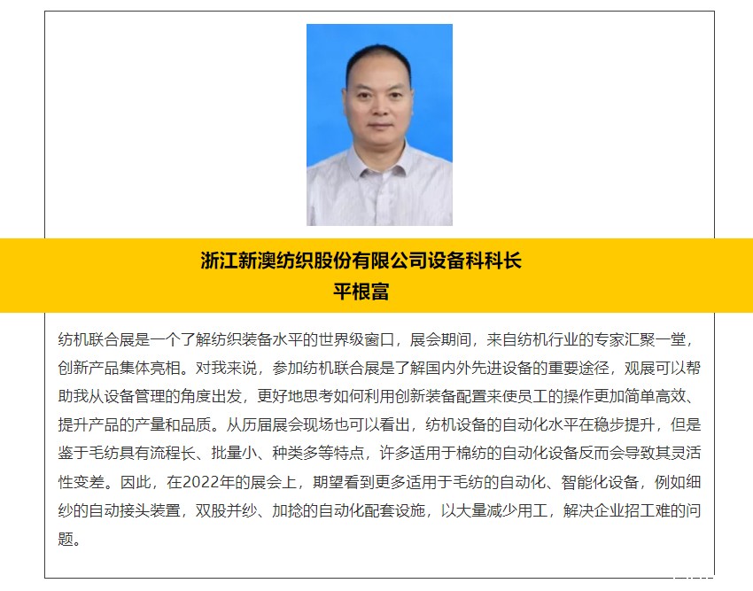 2020纺机联合展上,国内外主要棉纺设备制造企业均展现出了不俗的技术实力,展出设备的自动化水平不断提升。同时。在65000人次的海内外高质量专业观众中,有许多来自棉纺企业的连续多届观展的“老朋友”,他们凭借多年来积累的深厚的实践经验,通过在展会期间的交流与学习,形成了自己专业的观点和独特的见解。