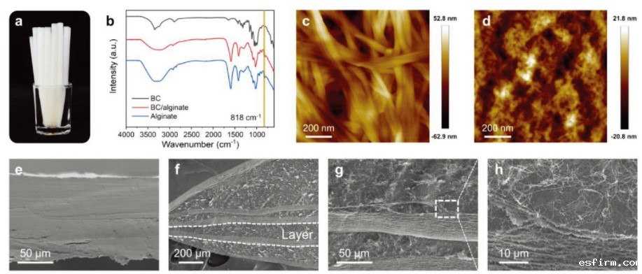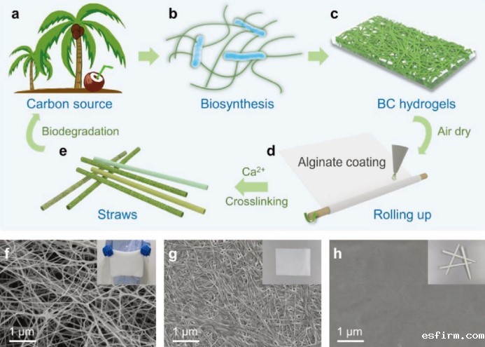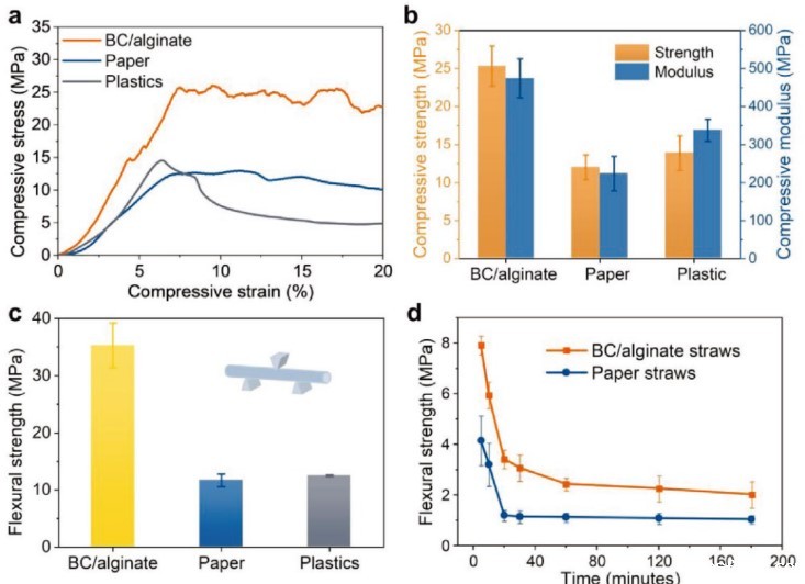 通过木葡萄糖酸醋杆菌合成的纤维素凝胶纯度相对较高(不含有木质素和半纤维素),3D纳米网络带来高力学性能。但是,细菌纤维素的亲水性会造成材料溶胀,降低力学性能。为了提高材料在湿态下的强度,研究人员在细菌纤维素表面修饰一层海藻酸钠,同时,海藻酸钠渗透到细菌纤维素3D纳米网络的孔隙中,与其形成大量氢键,从而形成牢固的连接,不需要胶水,就能通过卷曲得到吸管的形状。将吸管浸入乳酸钙溶液中,海藻酸钠和细菌纤维素可以通过钙离子进行交联,进一步提升力学强度。