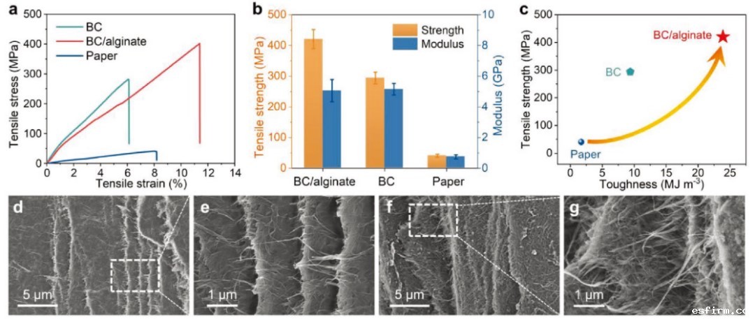 细菌纤维素、细菌纤维素-海藻酸钠以及纸张拉伸性能的比较