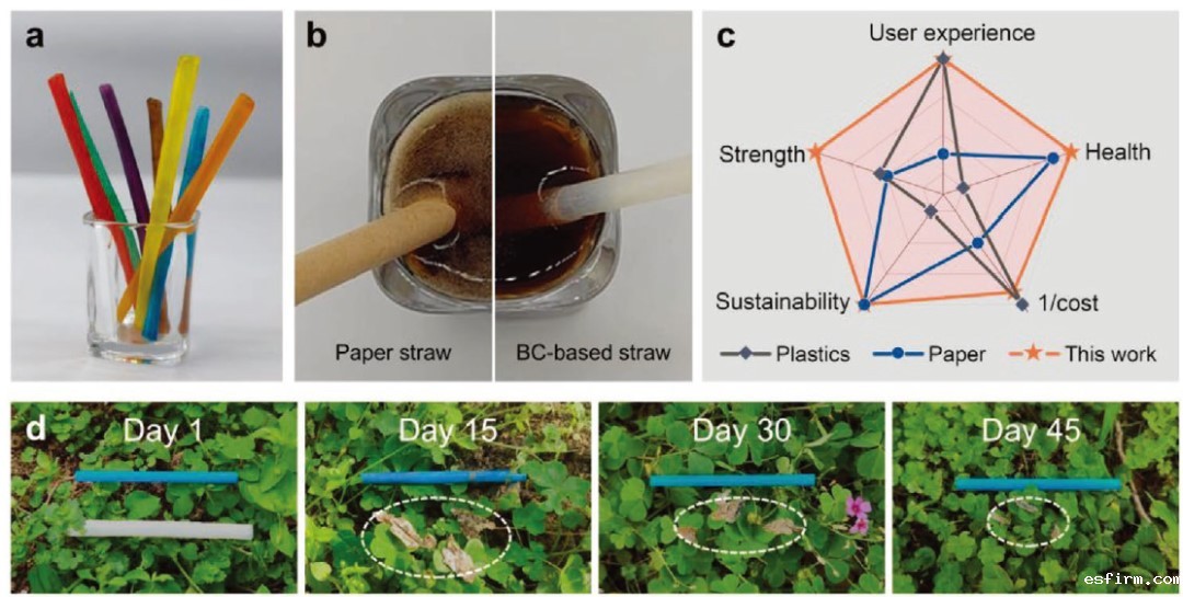 此外,研究人员还制备了一系列具有色彩的细菌纤维素吸管。这种吸管的口感可以通过加入水果或者蔬菜的提取物加以调节,提升用户体验。在埋入土壤15天后,细菌纤维素吸管已开始降解,45天后基本消失,60天后完全不见踪影。并且由于纸吸管表面粗糙,插入可乐中会造成大量气泡流失,影响口感,而研究人员研发的细菌纤维素吸管可以完美避免这个问题,并且在0~95 ℃的温度范围内,制备的吸管外形保持稳定。此外,这种吸管的成本平均每根只有0.3分,与塑料吸管(0.2分)差不多,而纸吸管则达到4分。因此这种基于细菌纤维素的吸管可以称之为吸管中的“六边形战士”。