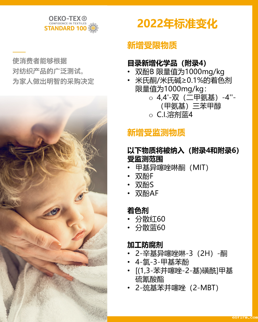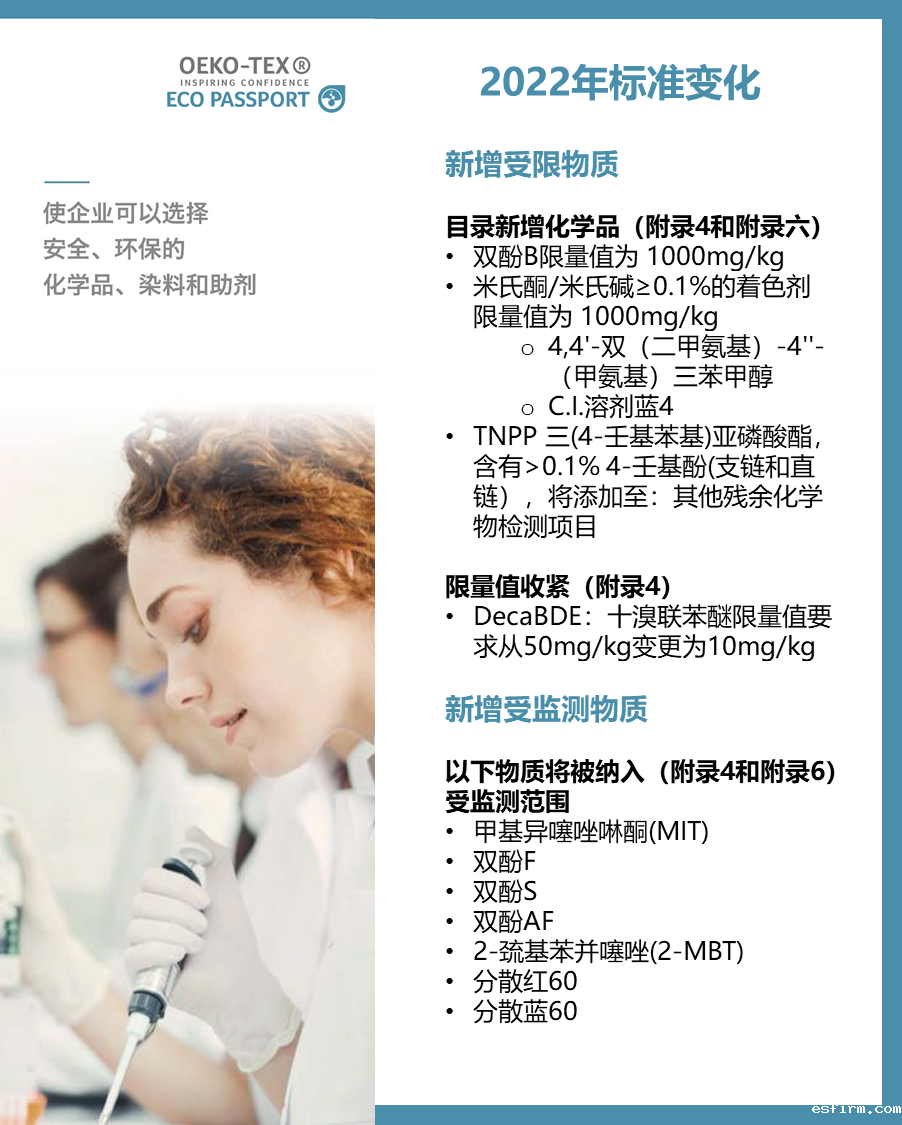 2022年,OEKO-TEX®将继续根据最新科学发现和相关规范的符合情况来监测各种物质。其中主要涉及部分工艺防腐剂以及双酚F、双酚S 和双酚AF。