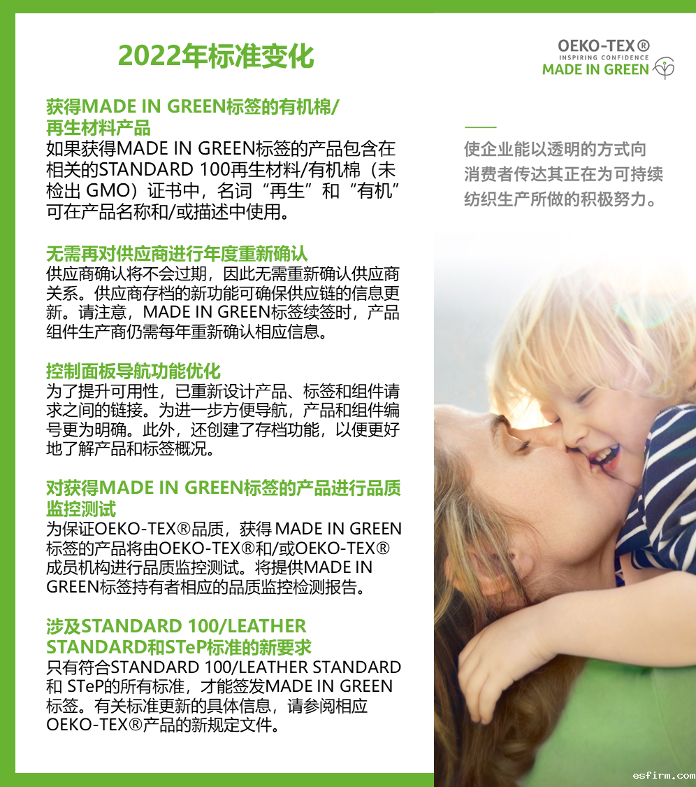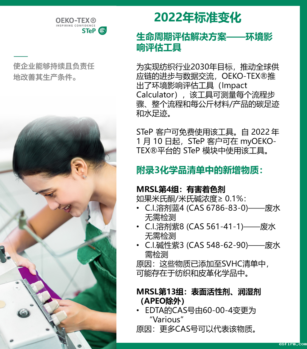 新年伊始,OEKO-TEX®协会发布了新的测试标准、限量值和具体要求。新规定将在过渡期后,从2022年 4月1日起正式生效。新的环境影响评估工具(Impact Calculator)现已可供 STeP by OEKO-TEX® 客户使用。该行业专用工具可提供对实现气候目标而言至关重要的碳足迹和水足迹数据。2022 年晚些时候,OEKO-TEX®还将推出全新的企业尽职调查认证:RESPONSIBLE BUSINESS by OEKO-TEX®。