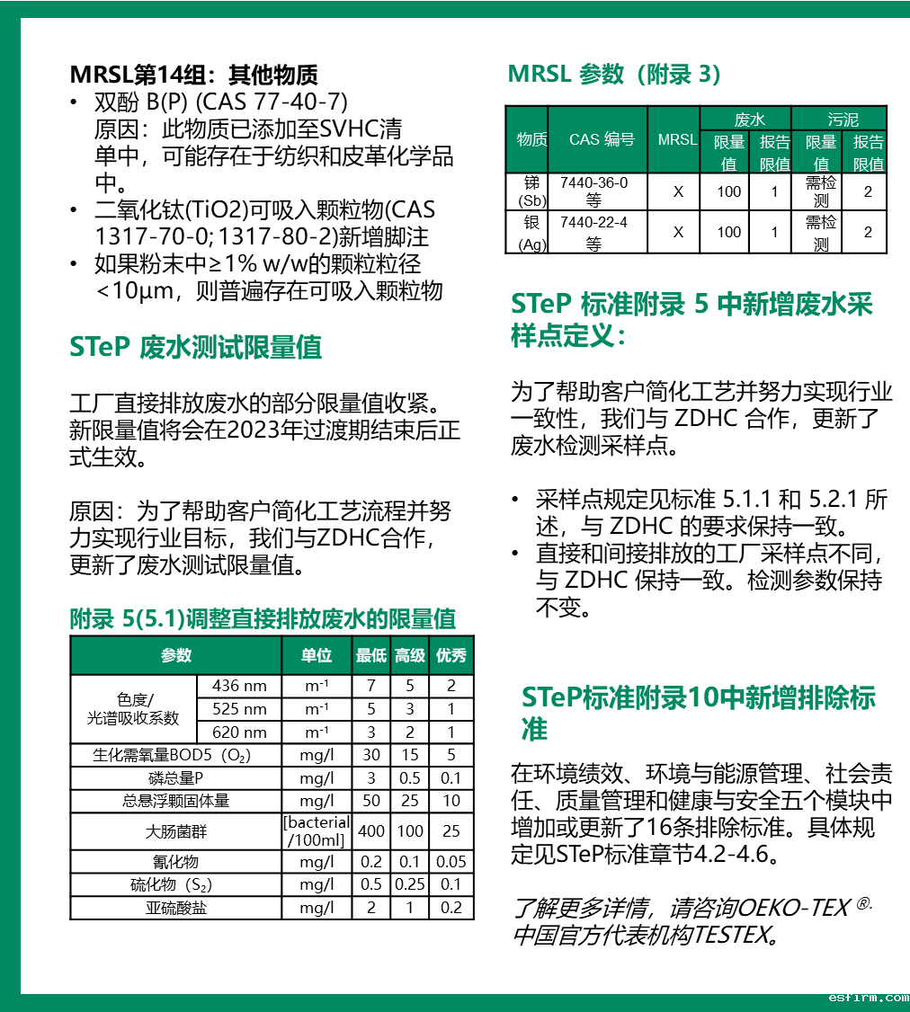 了对双酚B (BPB) 的限量值要求,并将其引入STeP by OEKO-TEX® MRSL清单。新增对米氏酮/米氏碱类着色剂的限量值要求。