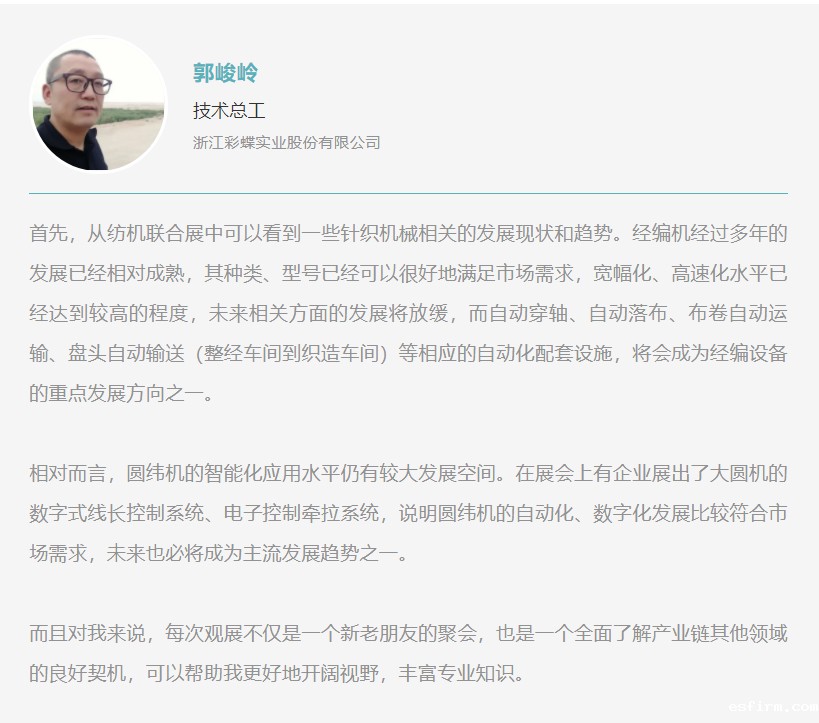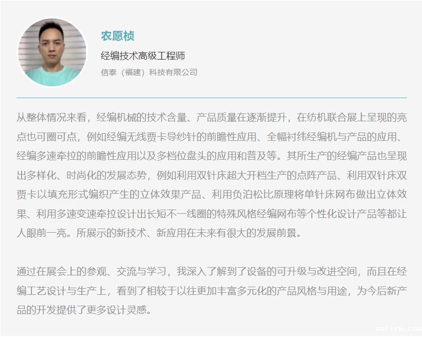 2020纺机联合展上,包括圆纬机、针织电脑横机、经编机等在内的各类针织设备均展示了各自的创新技术实力,进一步满足了特殊品种的差异化创新和个性化需求。在65000人次的海内外高质量专业观众中,有许多来自针织加工企业的专业观众,他们拥有在企业多年的生产经验,对设备的发展现状和目前行业对设备的需求具有独特的认识,同时对2022年纺机联合展抱有更多的期待与希冀。