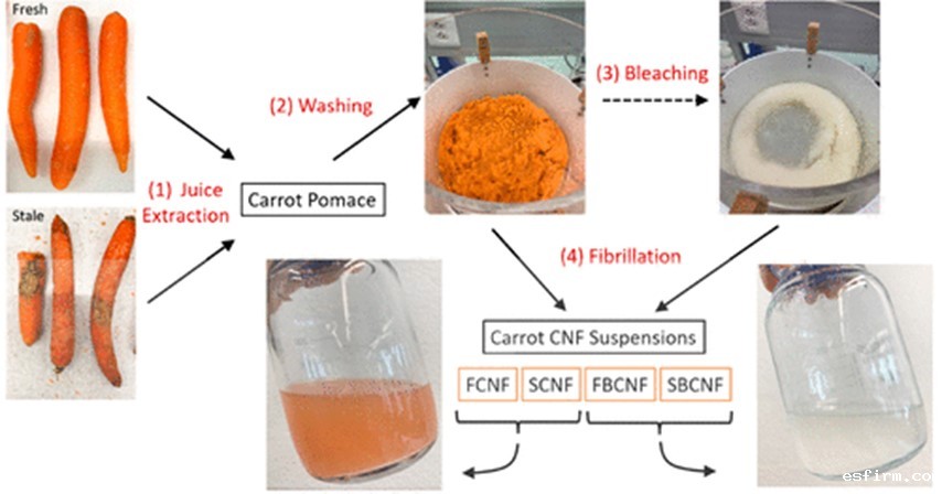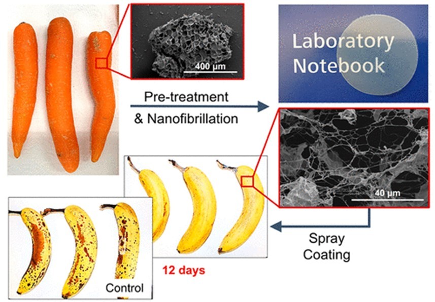 为解决不可降解塑料带来的挑战,研究人员积极开发环保可再生的新材料作为替代品。植物细胞壁的主要成分是纤维素,将其纳米化(或超微细化)处理后制成的纤维素纳米纤维(Celluouse Nanofibers,CNF)具有重量轻、韧性强、可降解等特点,在食品包装领域具有巨大的开发潜力。但CNF的工业生产仍然面临着严重的成本挑战。2019年全球大约生产了4500万t胡萝卜,榨汁后剩下的胡萝卜渣(占胡萝卜初始质量的30%~50%)通常被认为是废料,但却是生产高质量CNF的优质原料。瑞士联邦材料科学与技术研究所Tanja Zimmermann和Gustav Nystr?m带领研究人员以胡萝卜渣为原料,通过漂白、微流化等工艺制成的纤维素纳米纤维悬浮液可以用做蔬果保鲜涂层,无毒无害甚至可食用,能够将香蕉的保质期延长一个多星期。相关内容以Sustainable Cellulose Nanofiber Films fromCarrot Pomace as Sprayable Coatings for Food Packaging Applications为题发表在《ACS Sustainable Chemistry& Engineering》上。