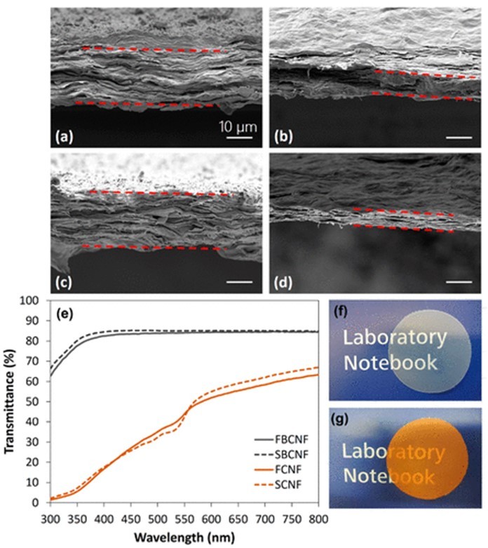 不同胡萝卜CNF薄膜的SEM图像、透光率和照片