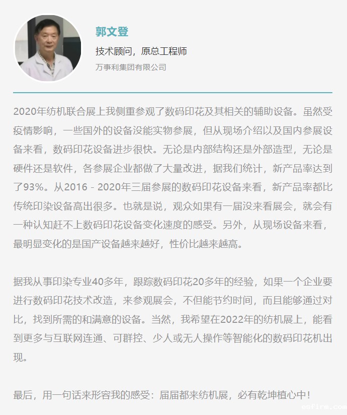 中国国际纺织机械展览会暨ITMA亚洲展览会是行业公认的纺机盛会,专业观众通过该平台一方面能了解当前纺机装备的最新进展,另一方面也能借机与行业同仁进行技术交流。2020纺机展上,许多企业的专业观众表示他们已经连续多届观展,通过在纺机展期间的交流与学习,他们结合各自的专业领域,也有一些收获及体会。