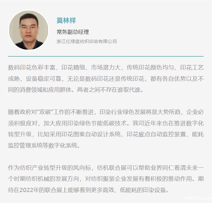 2022中国国际纺织机械展览会暨ITMA亚洲展览会将于2022年11月20-24日在国家会展中心(上海)举办。为多维度呈现全球纺织装备领域的发展现状及趋势,助力供给端与需求端实现有效对接,我们特设微信专栏——“纺织装备赋能产业发展新征程”,分别介绍纺纱、针织、染整、印花等领域行业观众的观展体验和观点,并呈现这几个领域的装备展示情况、展品亮点。