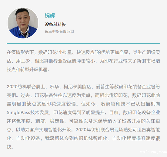 在2020纺机联合展上,国内外主要印花设备制造商纷纷携新款机型亮相。例如,宏华数码展出的VEGA8000DI高速高精智能数码喷墨印花机,喷印速度高达630米/小时;意大利MS公司展出的mini LARIO数码扫描直喷机,打印速度达18.2米/分钟;爱普生展出的MonnaLisa Evo Tre 16工业级直喷数码印花机,采用独特的Genesta原装墨水,成分安全环保。