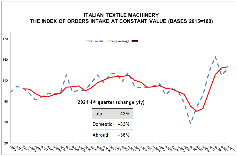 日前,意大利纺机制造商协会(ACIMIT)发表了2021年第四季度纺机订单指数,为127.9点(基数2015年=100),比去年同期增长了43%。该增长受意大利国内和国外市场的共同推动,与2020年同期相比,意大利国内订单激增了83%(订单指数为234.6点),国外订单增长了36%(订单指数为116.4点)。