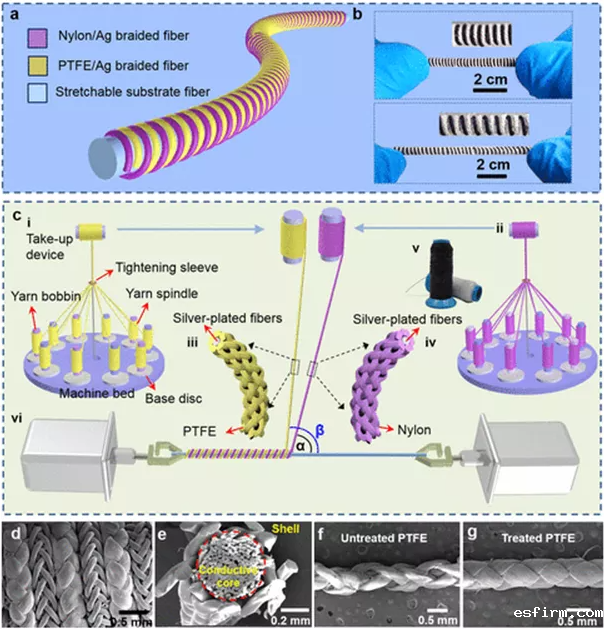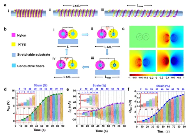 研究人员选择商用镀银锦纶作为电极,选择聚四氟乙烯纤维(PTFE)和锦纶作为摩擦电材料,通过包覆核壳纤维法将PTFE缠绕的镀银锦纶编织纤维和锦纶缠绕的镀银锦纶编织纤维交替缠绕在可拉伸的纤维基材上,PTFE纤维或锦纶用作壳层,镀银纤维作为芯层。壳层纤维缠绕在芯层纤维周围,二者相互缠绕交织在一起。两个摩擦电层(PTFE和锦纶)的接触分离可以通过传感器的拉伸释放运动来实现。在拉伸过程中,螺旋结构沿纵向伸长,相邻的锦纶和PTFE发生分离,直至达到最大拉伸应变。