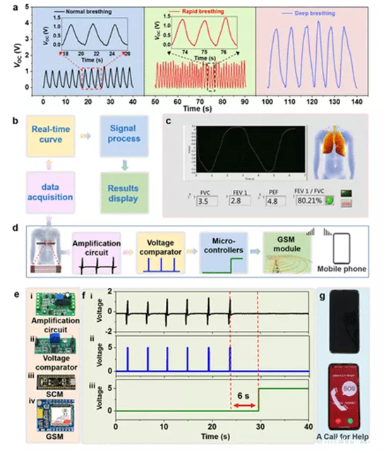 中国科学院北京纳米能源与系统研究所开发了一种自供电螺旋纤维应变传感器(HFSS),并基于该应变传感器开发了一种自供电智能穿戴式实时呼吸监测系统,可以测量一些关键的呼吸参数,用于疾病预防和医疗诊断。该智能报警器可根据人体呼吸行为的变化自动呼叫预设的手机求助。