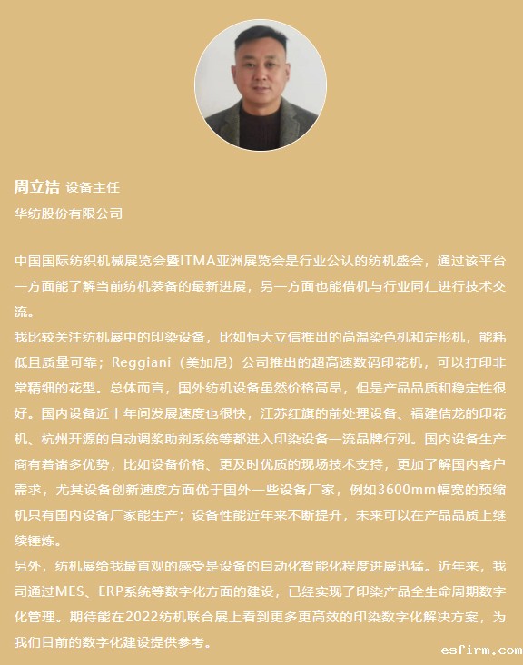 2022中国国际纺织机械展览会暨ITMA亚洲展览会将于2022年11月20-24日在国家会展中心(上海)举办。为多维度呈现全球纺织装备领域的发展现状及趋势,助力供给端与需求端实现有效对接,我们特设微信专栏——“纺织装备赋能产业发展新征程”,分别介绍纺纱、针织、染整、印花等领域行业观众的观展体验和观点,并呈现这几个领域的装备展示情况、展品亮点。