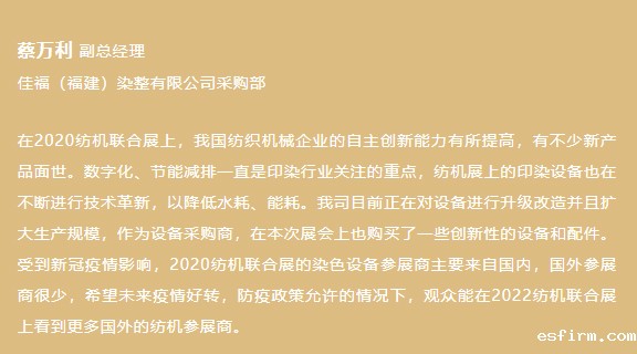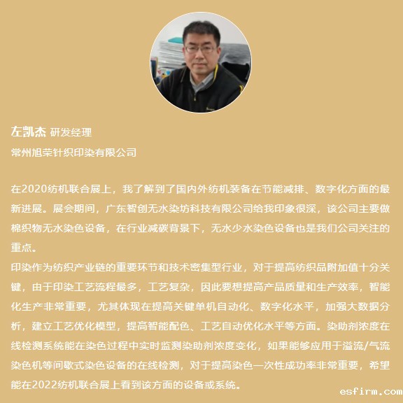 2020纺机联合展上,国内外印染设备参展商携各自的创新产品纷纷亮相,设备的数字化水平在不断提高。据参展商反馈,本次展会上的专业观众密度高于往届,说明纺机联合展已经成为纺织行业的风向标。现场的专业观众也纷纷表示纺机联合展对于行业意义重大,可以帮助业界同仁看清未来纺织机械的发展方向。