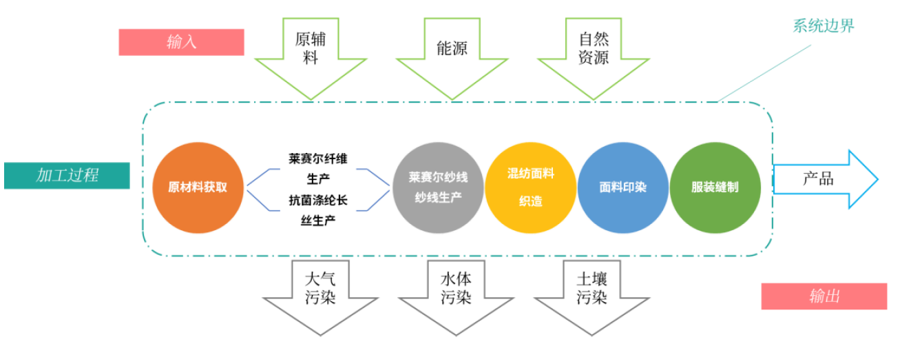 2021年,CNTAC-LCA工作组为伊芙丽作“零碳天丝TM莱赛尔混抗菌涤纶西装碳足迹评价”报告,运用LCAplus系统,以原材料获取阶段、纱线加工阶段、面料织造阶段、染色及后整理阶段和服装缝制阶段等5个阶段作为产品生命周期评价的系统边界,计算了产品生命周期的能源投入和资源消耗以及排放的各种环境负荷物质(废弃、废水、固体废弃物)数据。