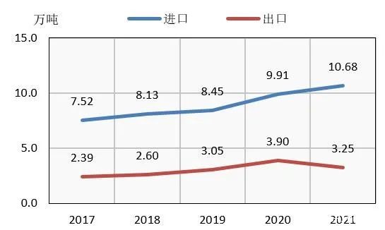 注:此图以及图3、图4中的2021年进口量和出口量是按2021年前11个月数据做的预测