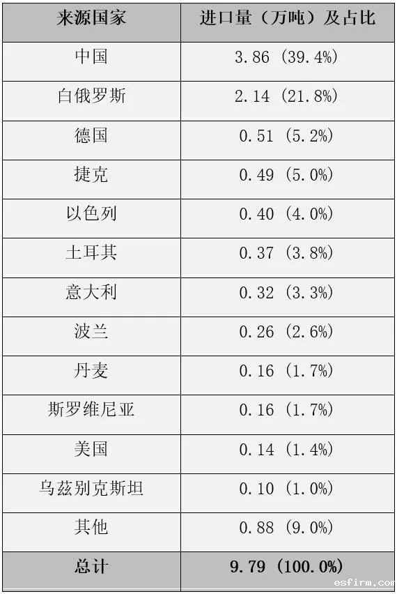据联邦海关总署报告,2021年1-11月俄罗斯非织造布进口量为9.79万吨,同比增长9.7%(图2)。俄罗斯非织造布进口最大来源国分别是中国和白俄罗斯,这两个国家在俄罗斯进口非织造布总量中的占比分别为39.4 %和21.8 % (表1)。