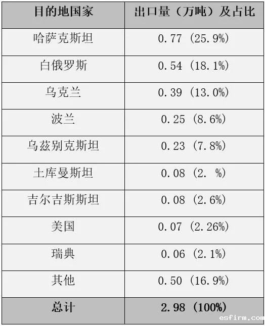 2021年前11个月俄罗斯非织造布出口量为2.98万吨,同比下降17.5%。哈萨克斯坦、白俄罗斯以及乌克兰为主要出口对象国,此三国在俄罗斯非织造布出口总量中的占比分别为25.9%、18.1%和13%(表2)。
