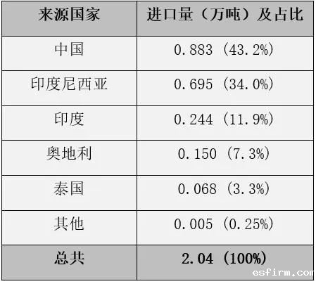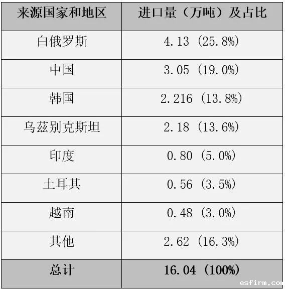 表3 俄罗斯2021年1-11月合成纤维进口量