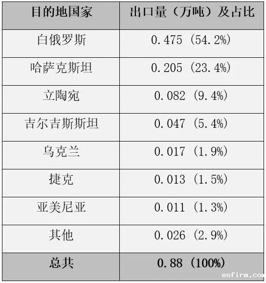 表4 俄罗斯2021年1-11月合成纤维出口量