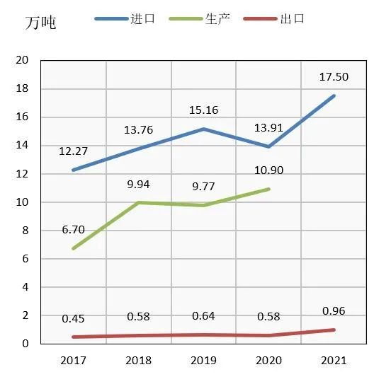 图3 俄罗斯2017-2021年合成纤维产量、进口量以及出口量