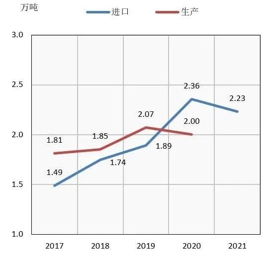 图4 俄罗斯近2017-2021年人造纤维进口量以及生产量