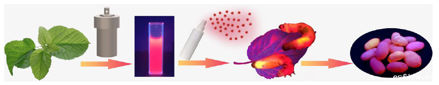天然蚕丝具有优异的生物相容性和力学性能,是一种用途广泛的纤维材料,但在紫外光照射下蚕丝呈淡蓝、淡黄色或无荧光效果。基因修饰技术和有机染料染色技术是制备荧光蚕丝的常用方式,但它们成本高、安全环保性差等问题也十分明显。因此,用无毒、生物相容性好、环境友好、高发光性和低成本的物质喂养蚕似乎是生产荧光蚕丝的最佳方法之一。
