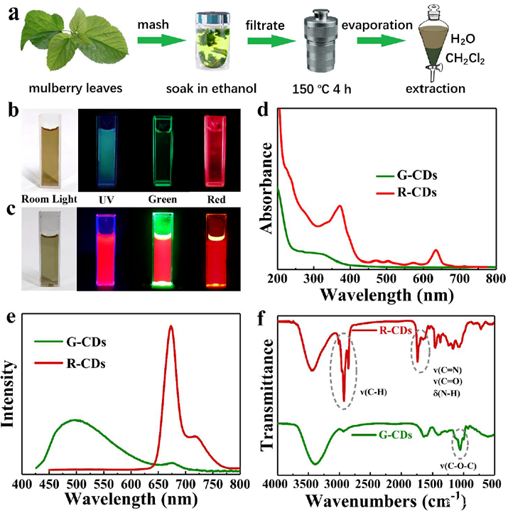 近日,复旦大学报道了一种以桑叶为原料制备的碳点(CDs),其具有较强的近红外荧光,绝对量子产率(QY)为73%,半峰全宽(FWHM)为20 nm,是迄今为止所知的最亮的深红色发射碳点(R-CDs),而且具有良好的生物相容性和荧光稳定性。
