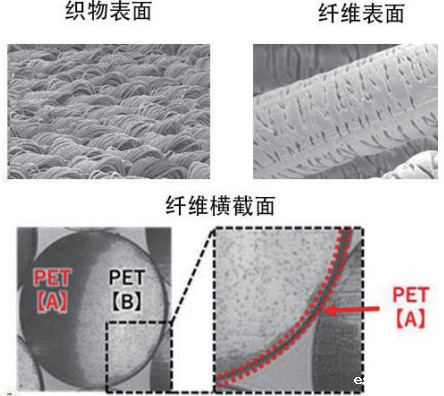 据悉,QticleTM是一种具有仿生结构的织物,将头发和羊毛的仿生结构与光滑柔软的质地和功能性相结合。东丽通过使用其专有的NANODESIGNTM复合纺丝技术,设计了一种具有超薄皮层偏心结构复合纤维,并结合特殊的纤维加工技术创造了卷曲结构,在纤维表面形成了细微的凹凸感。从横截面图片来看,该纤维包含两种不同类型的PET聚合物。