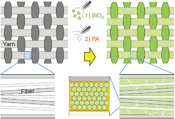 研究者开发了两步喷涂工艺。PET织物可以被视为层级多孔结构,纱线之间有大裂缝,纤维有小间隙。在第一次喷洒SiO2胶体溶液时,PET织物表面迅速形成一层薄薄的液膜,然后通过毛细管力将有限体积的胶体溶液完全吸收到多孔纱线中。随着加热过程中溶剂的蒸发,粒子自发沉淀形成液体胶体PC,然后转化为位于纤维之间的固体PC。在随后的PA黏合剂喷涂中,由于相同的毛细管相互作用,PA纳米颗粒也富集在SiO2颗粒填充的PET纱线表面。当样品加热到玻璃化转变温度以上后再冷却到室温时,PA纳米颗粒熔化、固化,并包裹PC结构和PET纱线,最终生成彩色的PC/PET织物。