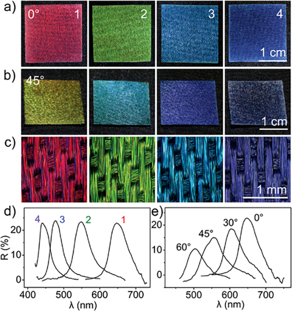 经验证,该喷涂工艺可生产出结构色均匀、饱和、多样的PC/PET织物。当光的入射角和反射角从0°变化到30°、45°和60°时,红色PC改性织物的反射波长相应地从650 nm变化到605 nm、555nm和503nm。