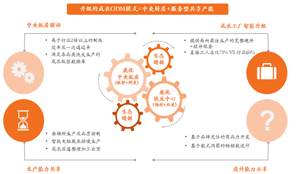 鹿优的款式开发能力-ODM核心关键能力。把握供应链主动权的核心策略是ODM,通过设计推款协同品牌客户的企划及设计部门在供应链周期更早阶段介入,将可以有效降低后期供应链快速反应的压力。鹿优聚拢行业离散的设计师工作室(非独立设计师个人)实施众包,依托自建的“中央板房”及“犀布面料图书馆”等基础设施,链通款式开发的“供需”,打造柔性化的设计打版能?,提效降本。