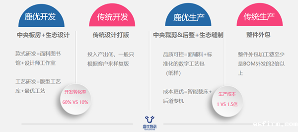鹿优的中央板房-需求转化的起点。板房的功能是将服装设计效果图向平面结构图转化成为成衣生产用的毛样(生产纸样),纸样的好坏向前决定了客户是否顺利下单,向后决定了服装生产的工艺成本。此外对于传统服装品牌来说,拓展品类有时候就意味着要重新组建打样团队。样衣的生产类似服装定制,费用在 500-3000 元不等,研发周期在 48-72 小时。除了研发资源匹配及成本的问题,更致命的问题在于设计需求沟通难以精准化。设计师往往与工业背景的制版师、样衣师之间存在语言不通的问题,从而导致信息传递失准,最终样衣需要重复修改、反复研发,造成资源浪费,整个过程中的磋商成本极高。鹿优数科的中央板房建设了可将设计师的设计语言翻译成样衣师和制版师能够读懂的工业化语言并建设数据库:例如AI自动推荐长袖T恤与长袖卫衣在袖长与大身的不同最优尺寸比例,从而降低沟通成本;鹿优数科的中央板房向各生产单元输出“数字工艺包-纸样”,形成可复制的缝制生产标准。